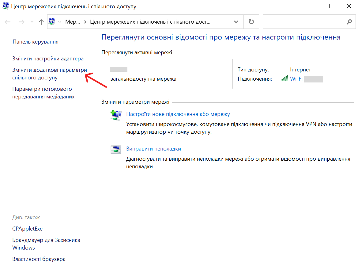Якщо ти під’єднуєшся до Wi-Fi з ноутбука з операційною системою Windows, варто перевірити, чи не надаєш ти спільний доступ до своїх файлів усім пристроям у мережі. Для цього варто виконати такі дії: після підключення до Wi-Fi зайди у «Налаштування» → «Мережа й інтернет» → «Центр мереж і спільного доступу» → «Змінити додаткові параметри спільного доступу». Далі прогорни вниз до «Спільний доступ до файлів і принтерів» та постав прапорець біля «Вимкнути спільний доступ…».