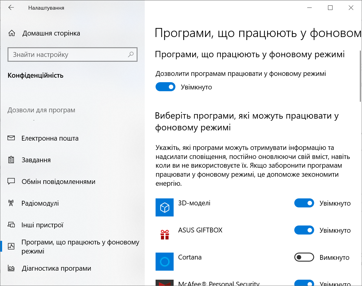 Щоб знайти дані про застосунки, які працюють у фоновому режимі, натисни на «Пуск» «Настройки» «Конфіденційність» прогорни вниз бічне меню і серед дозволів вибери «Програми, що працюють у фоновому режимі». Змінити доступ до фонового режиму можна натиснувши на перемикач справа від необхідної програми.