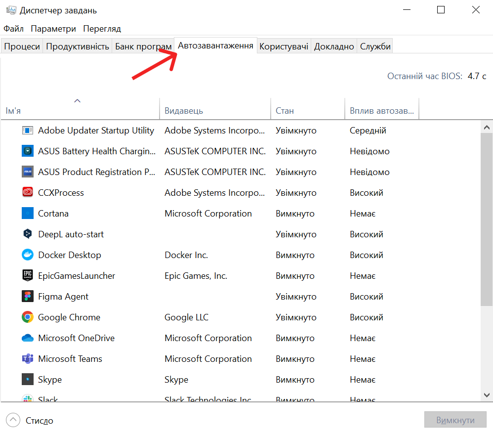 У вкладці «Автозавантаження» є колонка з назвою «Вплив автозавантаження». Вона показує, скільки ресурсів комп’ютера програма споживає під час завантаження та як цей автозапуск впливає на процесор. Якщо ти бачиш програму з високим впливом, рекомендуємо вимкнути можливість автоматичного запуску.