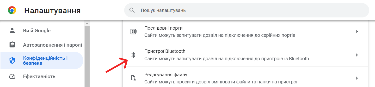 Доступ сайтів до Bluetooth є експериментальною функцією Chrome та Opera. Якщо у тебе є потреба в користуванні сайтами, які обґрунтовано вимагають доступ до Bluetooth, можеш прочитати наш матеріал з покроковою інструкцією щодо увімкнення цього експериментального функціоналу