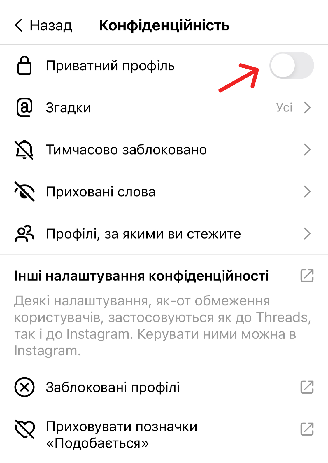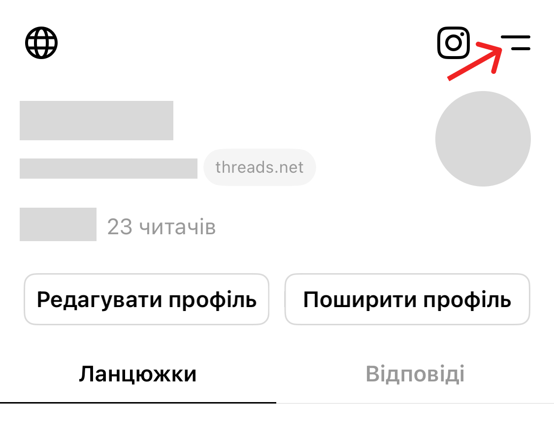 Загалом всі параметри приватності, які можна змінити у Threads, знаходяться у налаштуваннях конфіденційності. Щоб знайти їх, перейди у свій акаунт, далі натисни на «Налаштування» (іконка з двома рисками у правому верхньому кутку) і вибери «Конфіденційність».