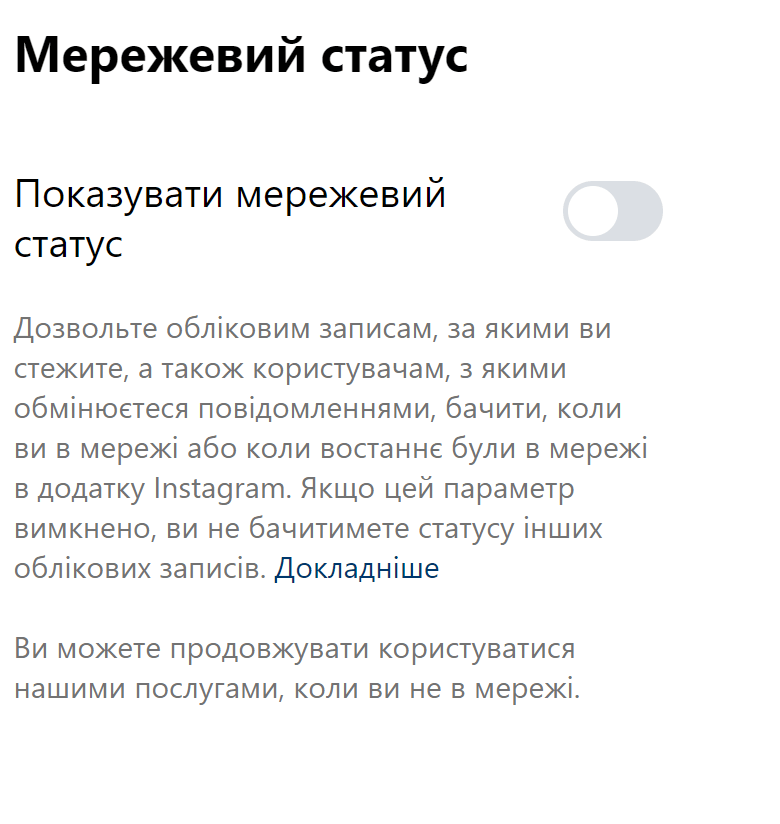 Приховуючи свій мережевий статус, ви також не зможете бачити, хто з ваших друзів зараз онлайн. Щоб вимкнути це перейдіть до налаштувань у «Як інші люди можуть взаємодіяти з вами» відкрийте «Повідомлення й відповіді на розповіді» → «Показувати мережевий статус» та вимкніть перемикач.