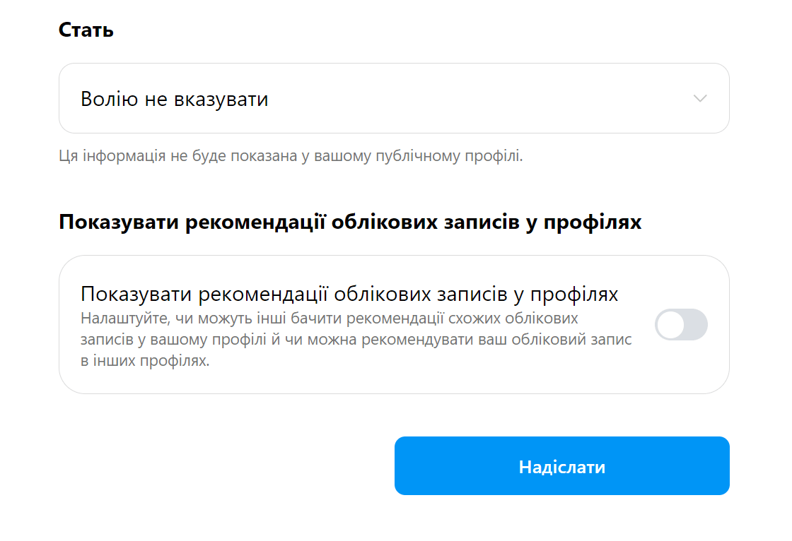 Якщо ви хочете, щоб ваш акаунт не відображався іншим користувачам як схожий, ви можете змінити це у параметрах профілю через браузер – у додатку немає такої функції. Для цього перейдіть у «Налаштування» → «Редагувати профіль» або скористайтеся посиланням. Далі зніміть прапорець біля меню «Показувати рекомендації облікових записів у профілях».