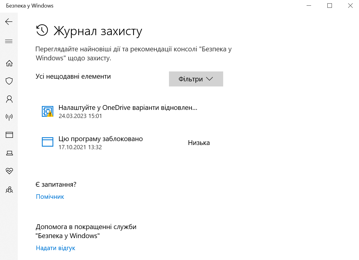 Історія дій та рекомендації стосовно захисту комп’ютера можна переглянути у «‎Журналі захисту». Події відображаються у вигляді карток, які можна відкрити. Якщо якийсь елемент потребує уваги, в залежності від серйозності проблеми біля іконки відображається значок: