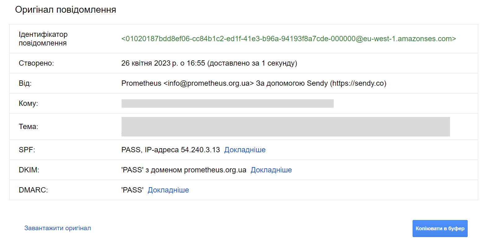 Також у заголовку «Authentification-Results» необхідно шукати рядок «spf=pass». SPF (Sender Policy Framework) запобігає підробці адреси відправника. Власник домену самостійно створює список серверів, які можуть відправляти електронну пошту від його імені. Коли поштовий сервіс отримує електронний лист, він може перевірити, чи є цей відправник у списку серверів. Якщо так, то в заголовках з’являється рядок «spf=pass», у протилежному випадку – «spf=fail». Gmail відображає результати перевірки SPF над оригіналом листа.