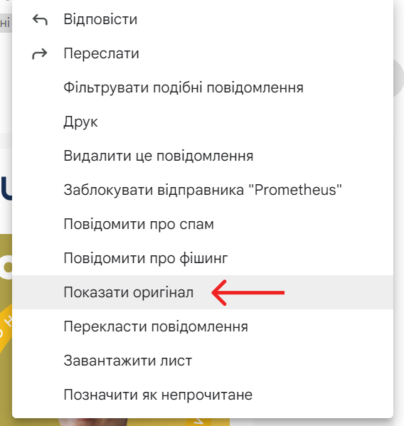 Перевірити лист на Email Spoofing можна подивившись його заголовки. Для цього відкрийте лист, далі натисніть на «Більше» (зазвичай це три крапки у правому верхньому кутку) та виберіть «Показати оригінал» або «Завантажити лист».