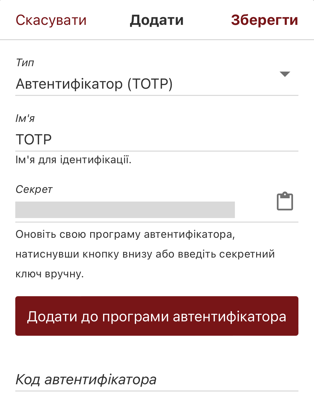 У разі налаштування аутентифікації через телефон в Tutanota з’явиться кнопка «Додати до програми автентифікатора». Таким чином всі необхідні дані одразу будуть додані до твого аутентифікатора, і тобі залишиться тільки ввести одноразовий код у спеціальне поле в Tutanota.