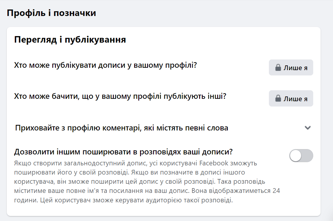 Також у меню «Профіль і позначки» ви можете обмежити тих, хто може бачити публікації інших людей у вашому профілі. Для цього біля налаштування «Хто може бачити, що у вашому профілі публікують інші?» натисніть на «Усі» і виберіть «Лише я» або зробіть свій список через пункт меню «Власний». Після вибору потрібного варіанту клікніть на «Зберегти».